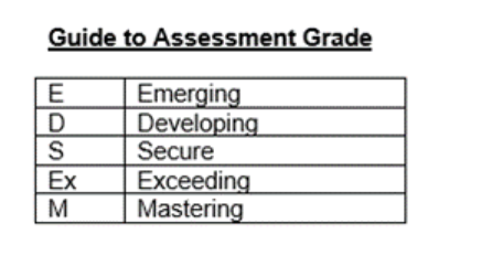 Each subject identifies knowledge and skills that should be acquired by the end of the academic year. A student who achieves this knowledge and skills would be considered “secure”. A student who doesn’t acquire all the knowledge and skills required by the end of the year would be considered “emerging or developing." A student achieving more than the required knowledge and skills by the end of the academic year would be “exceeding or mastering".